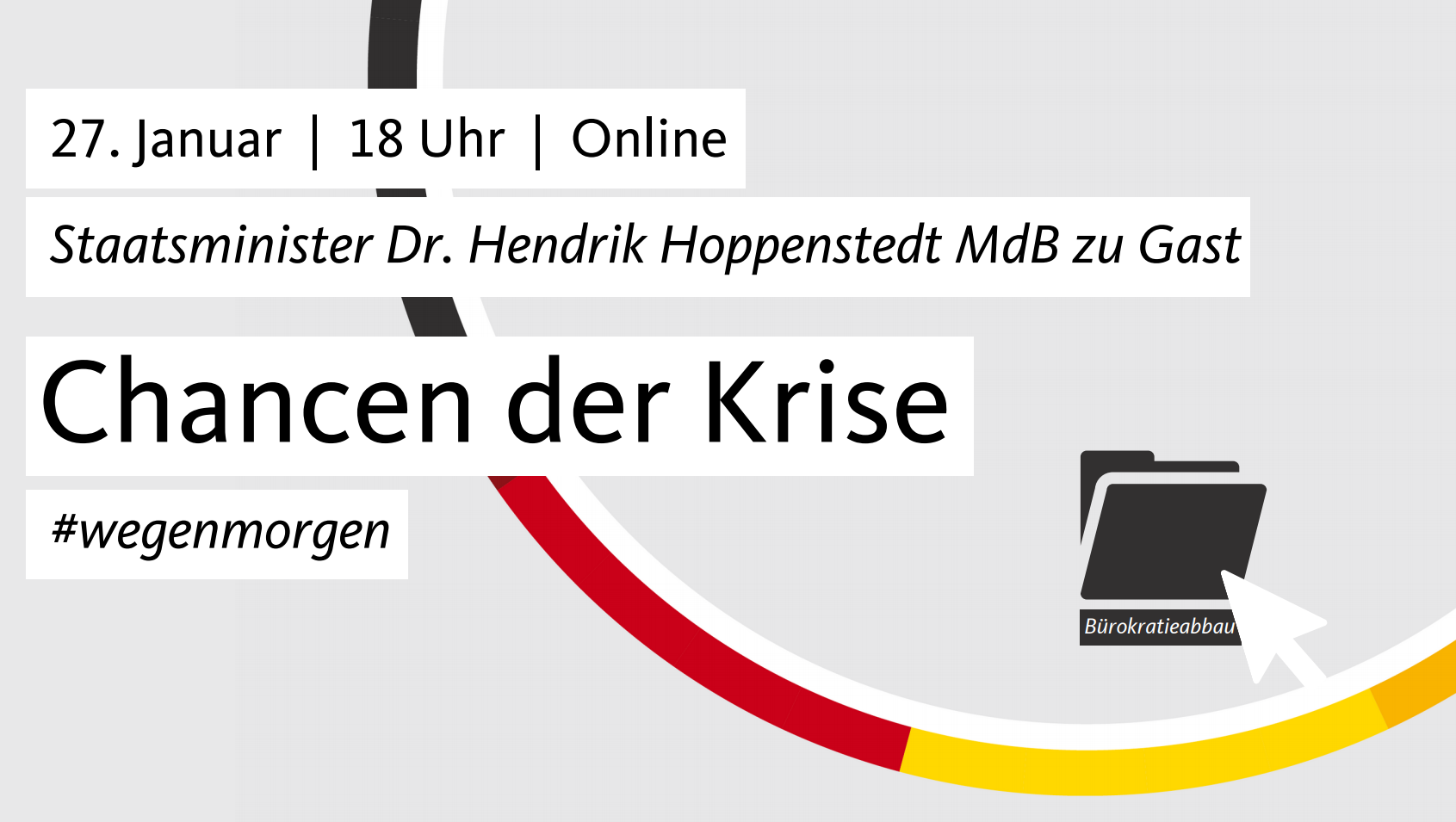Am 27. Januar haben wir das Glück, einen der Architekten dieses Übergangs zu Gast in unseren Kreisverbänden zu haben. Dr. Hendrik Hoppenstedt ist Staatsminister bei der Bundeskanzlerin. Er vertritt dort den Chef des Bundeskanzleramtes und koordiniert die Bund-Länder-Beziehungen und den Bürokratieabbau mitsamt der Verbesserung der Rechtssetzung. Wie kommen wir aus der Pandemie und welche Chancen eröffnet diese Krise?